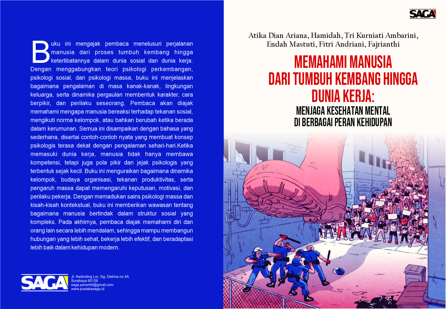 Buku ini mengajak pembaca menelusuri perjalanan manusia dari proses tumbuh kembang hingga keterlibatannya dalam dunia sosial dan dunia kerja. Dengan menggabungkan teori psikologi perkembangan, psikologi sosial, dan psikologi massa, buku ini menjelaskan bagaimana pengalaman di masa kanak-kanak, lingkungan keluarga, serta dinamika pergaulan membentuk karakter, cara berpikir, dan perilaku seseorang. Pembaca akan diajak memahami mengapa manusia bereaksi terhadap tekanan sosial, mengikuti norma kelompok, atau bahkan berubah ketika berada dalam kerumunan. Semua ini disampaikan dengan bahasa yang sederhana, disertai contoh-contoh nyata yang membuat konsep psikologis terasa dekat dengan pengalaman sehari-hari.Ketika memasuki dunia kerja, manusia tidak hanya membawa kompetensi, tetapi juga pola pikir dan jejak psikologis yang terbentuk sejak kecil. Buku ini menguraikan bagaimana dinamika kelompok, budaya organisasi, tekanan produktivitas, serta pengaruh massa dapat memengaruhi keputusan, motivasi, dan perilaku pekerja. Dengan memadukan sains psikologi massa dan kisah-kisah kontekstual, buku ini memberikan wawasan tentang bagaimana manusia bertindak dalam struktur sosial yang kompleks. Pada akhirnya, pembaca diajak memahami diri dan orang lain secara lebih mendalam, sehingga mampu membangun hubungan yang lebih sehat, bekerja lebih efektif, dan beradaptasi lebih baik dalam kehidupan modern.