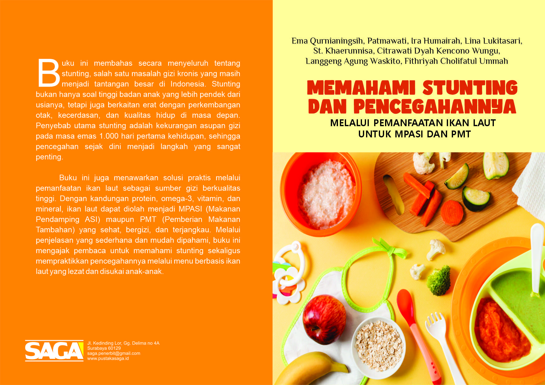 Buku ini membahas secara menyeluruh tentang stunting, salah satu masalah gizi kronis yang masih menjadi tantangan besar di Indonesia. Stunting bukan hanya soal tinggi badan anak yang lebih pendek dari usianya, tetapi juga berkaitan erat dengan perkembangan otak, kecerdasan, dan kualitas hidup di masa depan. Penyebab utama stunting adalah kekurangan asupan gizi pada masa emas 1.000 hari pertama kehidupan, sehingga pencegahan sejak dini menjadi langkah yang sangat penting. Buku ini juga menawarkan solusi praktis melalui pemanfaatan ikan laut sebagai sumber gizi berkualitas tinggi. Dengan kandungan protein, omega-3, vitamin, dan mineral, ikan laut dapat diolah menjadi MPASI (Makanan Pendamping ASI) maupun PMT (Pemberian Makanan Tambahan) yang sehat, bergizi, dan terjangkau. Melalui penjelasan yang sederhana dan mudah dipahami, buku ini mengajak pembaca untuk memahami stunting sekaligus mempraktikkan pencegahannya melalui menu berbasis ikan laut yang lezat dan disukai anak-anak.