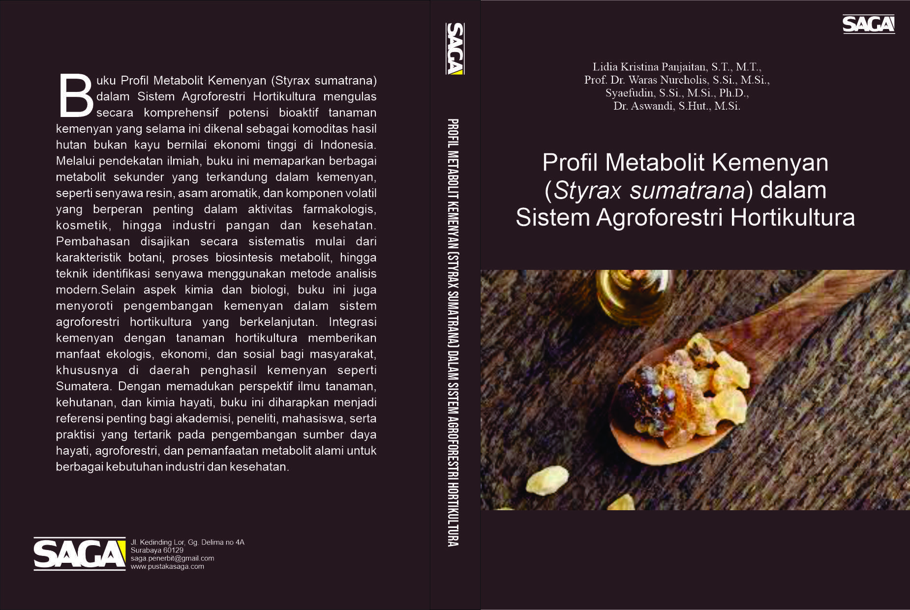 Buku Profil Metabolit Kemenyan (Styrax sumatrana) dalam Sistem Agroforestri Hortikultura mengulas secara komprehensif potensi bioaktif tanaman kemenyan yang selama ini dikenal sebagai komoditas hasil hutan bukan kayu bernilai ekonomi tinggi di Indonesia. Melalui pendekatan ilmiah, buku ini memaparkan berbagai metabolit sekunder yang terkandung dalam kemenyan, seperti senyawa resin, asam aromatik, dan komponen volatil yang berperan penting dalam aktivitas farmakologis, kosmetik, hingga industri pangan dan kesehatan. Pembahasan disajikan secara sistematis mulai dari karakteristik botani, proses biosintesis metabolit, hingga teknik identifikasi senyawa menggunakan metode analisis modern.Selain aspek kimia dan biologi, buku ini juga menyoroti pengembangan kemenyan dalam sistem agroforestri hortikultura yang berkelanjutan. Integrasi kemenyan dengan tanaman hortikultura memberikan manfaat ekologis, ekonomi, dan sosial bagi masyarakat, khususnya di daerah penghasil kemenyan seperti Sumatera. Dengan memadukan perspektif ilmu tanaman, kehutanan, dan kimia hayati, buku ini diharapkan menjadi referensi penting bagi akademisi, peneliti, mahasiswa, serta praktisi yang tertarik pada pengembangan sumber daya hayati, agroforestri, dan pemanfaatan metabolit alami untuk berbagai kebutuhan industri dan kesehatan.